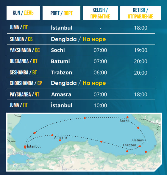 Тўлов Круиз бошланишидан 40 кун олдин тўлиқ тўланиши керак.